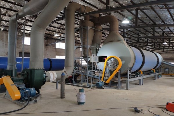 該設(shè)備工作時(shí):馬尾藻渣會(huì)首先通過螺旋擠壓脫水機(jī)進(jìn)行脫水處理,將原本含水量在80%左右的馬尾藻渣中的水分快速降低,這一步既可以提高烘干效率,又可以節(jié)省熱源的消耗。為下一步的烘干過程做準(zhǔn)備。之后脫水處理好的的馬尾藻渣會(huì)先經(jīng)打散設(shè)備進(jìn)行打散處理,之后經(jīng)過上料設(shè)備進(jìn)入烘干機(jī)干機(jī)滾筒內(nèi)。由于馬尾藻渣粘性較小,不易堵塞設(shè)備,因此馬尾藻渣烘干機(jī)采用三筒烘干機(jī)的方案,有點(diǎn)是既可以節(jié)省占地面積,又可以提升烘干效果。烘干機(jī)滾筒機(jī)內(nèi)壁設(shè)置有抄板,將物料不斷抄起,有助于增大于熱風(fēng)的接觸面積,又有打散效果。滾筒采用順流烘干的方案,滾筒傾斜放置。隨著滾筒旋轉(zhuǎn)會(huì)緩慢向出料口移動(dòng),隨著出料設(shè)備排出烘干系統(tǒng)。氣體經(jīng)過脫硫除塵之后,排入大氣。烘干好的物料經(jīng)過壓制成為優(yōu)質(zhì)飼料,被打包裝走用作飼料。